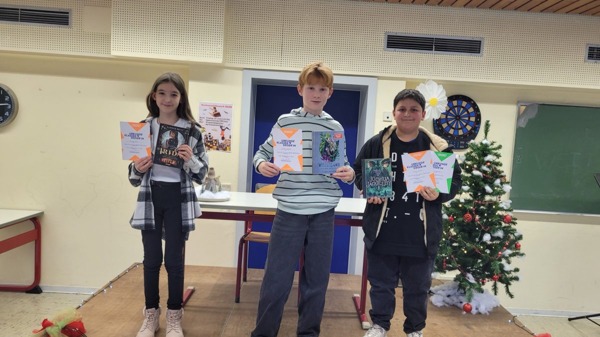 Die diesjährigen Klassensieger Luke Hamacher (6a), Emily Peters (6b) und Ilyas Kesman (6c) zeigten ihr Können und stellten eine Passage aus ihren Lieblingsbüchern vor.