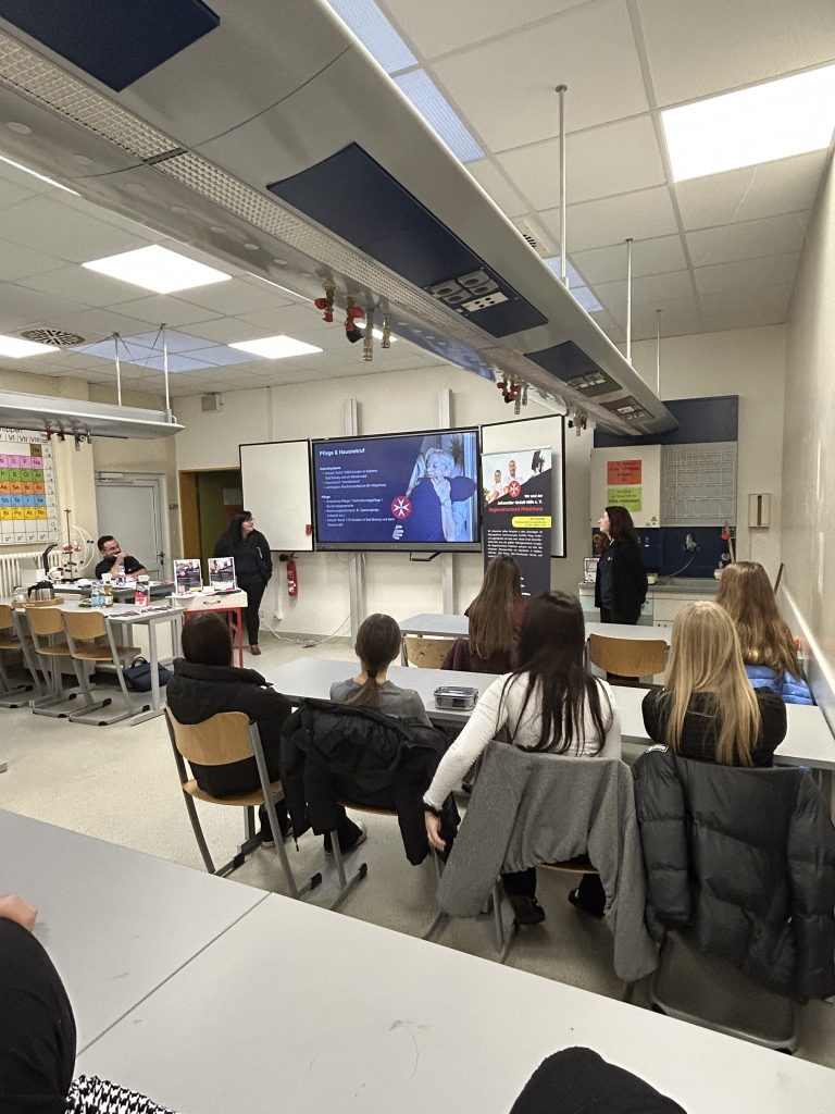 Den Abschluss bildete der Besuch der Johanniter-Unfall-Hilfe e.V.. Frau Merzenich, Frau Beyer und Herr Zimmermann stellten den Regionalverband Mittelrhein vor und präsentierten die vielfältigen Aufgabenbereiche der Johanniter. Unter dem Leitgedanken, Menschen jeden Alters in allen Lebenslagen zu unterstützen, informierten sie über Pflege und Hausnotruf, ambulante Pflege, Verhinderungspflege sowie Beratungsgespräche. Zudem stellten sie Ausbildungsmöglichkeiten in der ambulanten Pflege vor, darunter die Ausbildung zur Pflegeassistenz und zur Pflegefachkraft. Weitere Einblicke erhielten die Schülerinnen und Schüler in den Rettungsdienst und Fahrdienst sowie in die Kinder- und Jugendhilfe. Auch das Ehrenamt – etwa im Sanitätsdienst und Katastrophenschutz – wurde vorgestellt. Abschließend wiesen die Referentinnen und Referenten auf die Möglichkeit hin, ein Freiwilliges Soziales Jahr (FSJ) bei den Johannitern zu absolvieren.